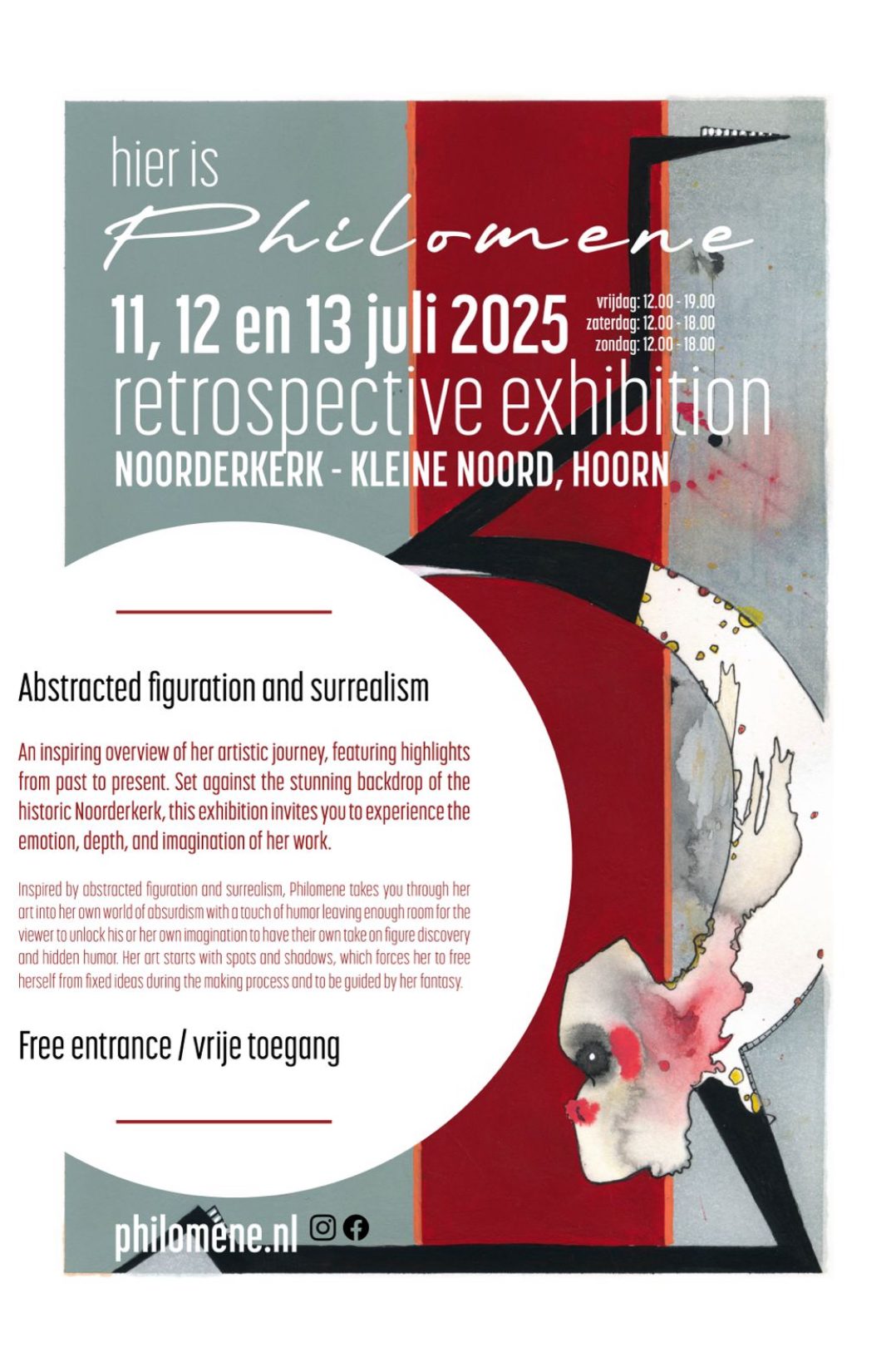 Inspired by abstracted figuration and surrealism, Philomene takes you through her art into her own world of absurdism with a touch of humor leaving enough room for the viewer to unlock his or her own imagination to have their own take on figure discovery and hidden humor. Her art starts with spots and shadows, which forces her to free herself from fixed ideas during the making process and to be guided by her fantasy.